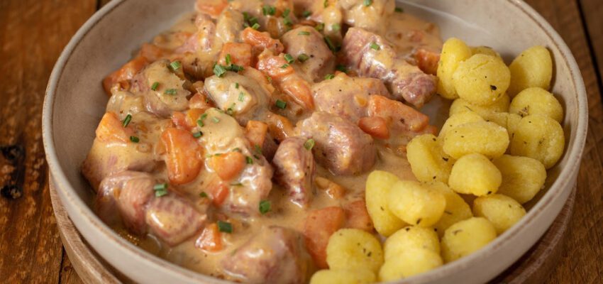 - Sie können den Eintopf mit einigen glutenfreien gebackenen Gnocchi servieren. Sie können die Gnocchi kurz in der Pfanne anbraten oder kurz in den Airfryer geben, damit sie knusprig werden.