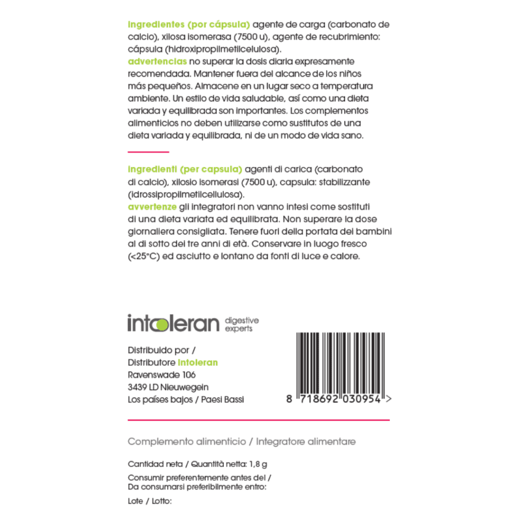 Ingredientes: Relleno: carbonato cálcico; Xilosa Isomerasa (7500 u); HPMC (cápsula).