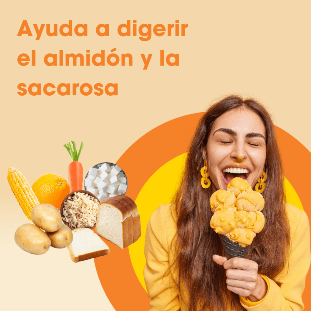 El almidón está formado por dos largas cadenas de moléculas de carbohidratos unidas. La enzima digestiva Glucoamilasa descompone el almidón en el intestino delgado en azúcares más pequeños, lo que facilita su digestión. Si no hay suficiente glucoamilasa, el almidón no se puede descomponer de forma eficaz, lo que provoca una menor absorción en el intestino delgado.